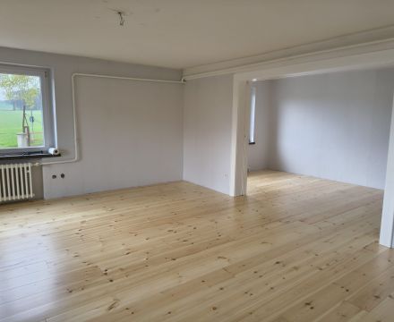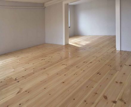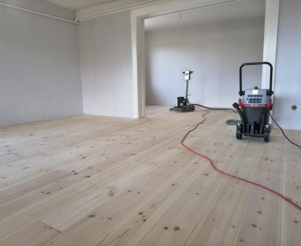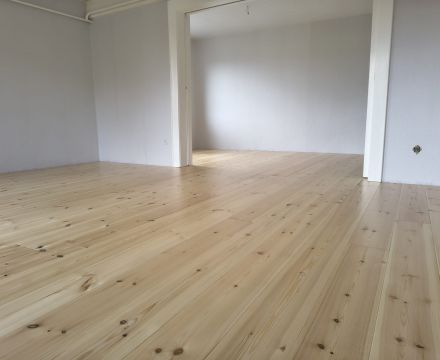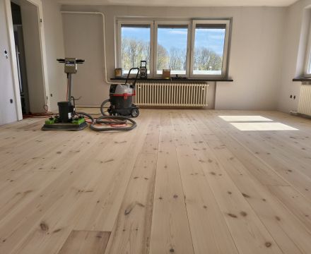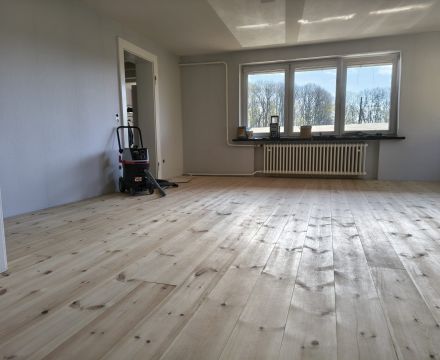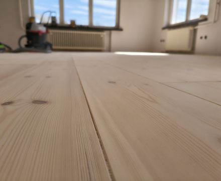 Unser Kunde hat sich hier für einen Dielenboden aus nordischer Kiefer und gegen einen komplett neuen Bodenaufbau entschieden.