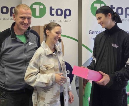 Empfangen wurde er von Frau Nake, Bereichsleiterin, sowie von Herrn Volkmer, einem erfahrenen Kollegen aus dem Bereich der Gebäudereinigung. Beide stehen ihm mit Rat und Tat zur Seite und begleiten ihn auf seinem Weg in die Berufswelt.